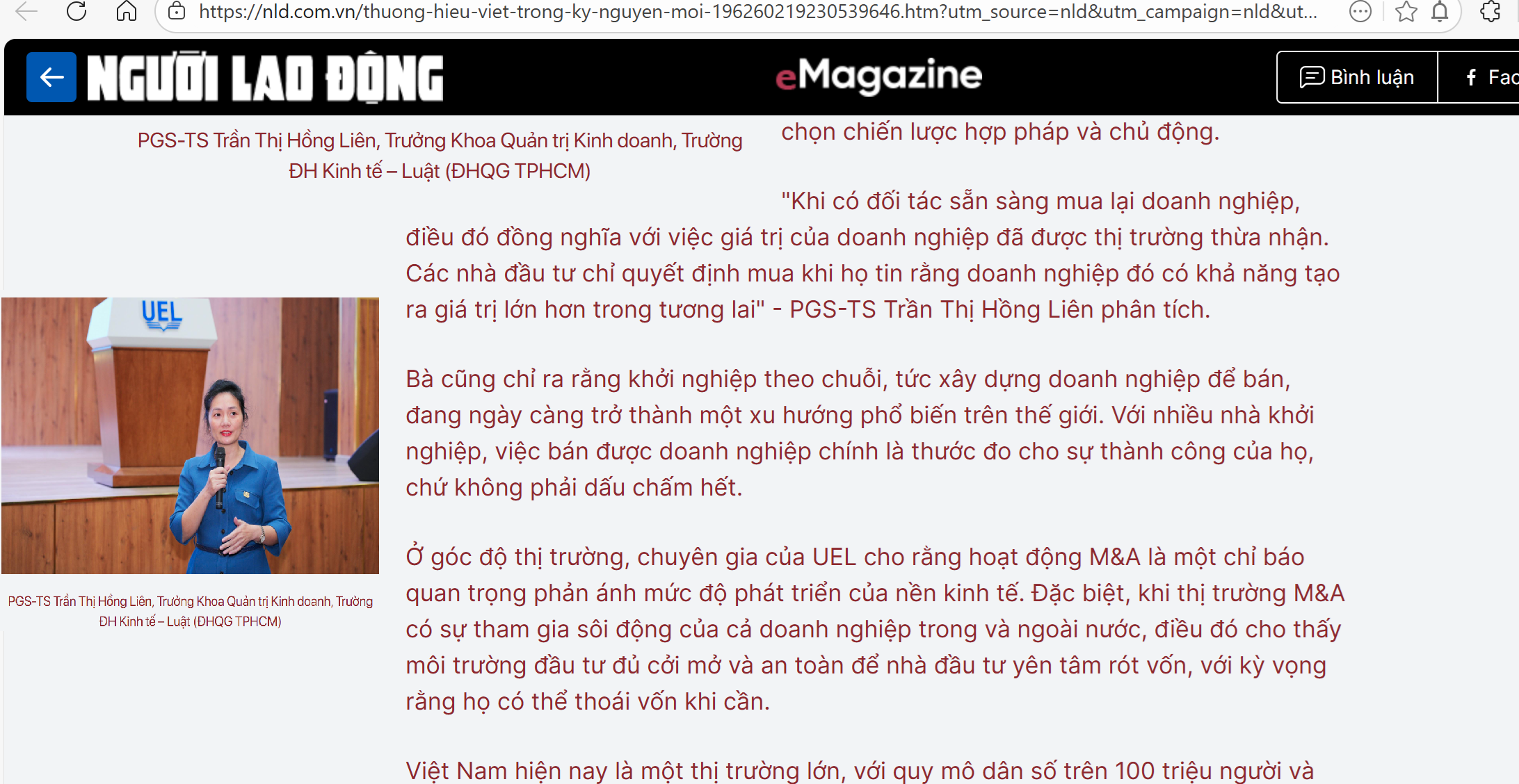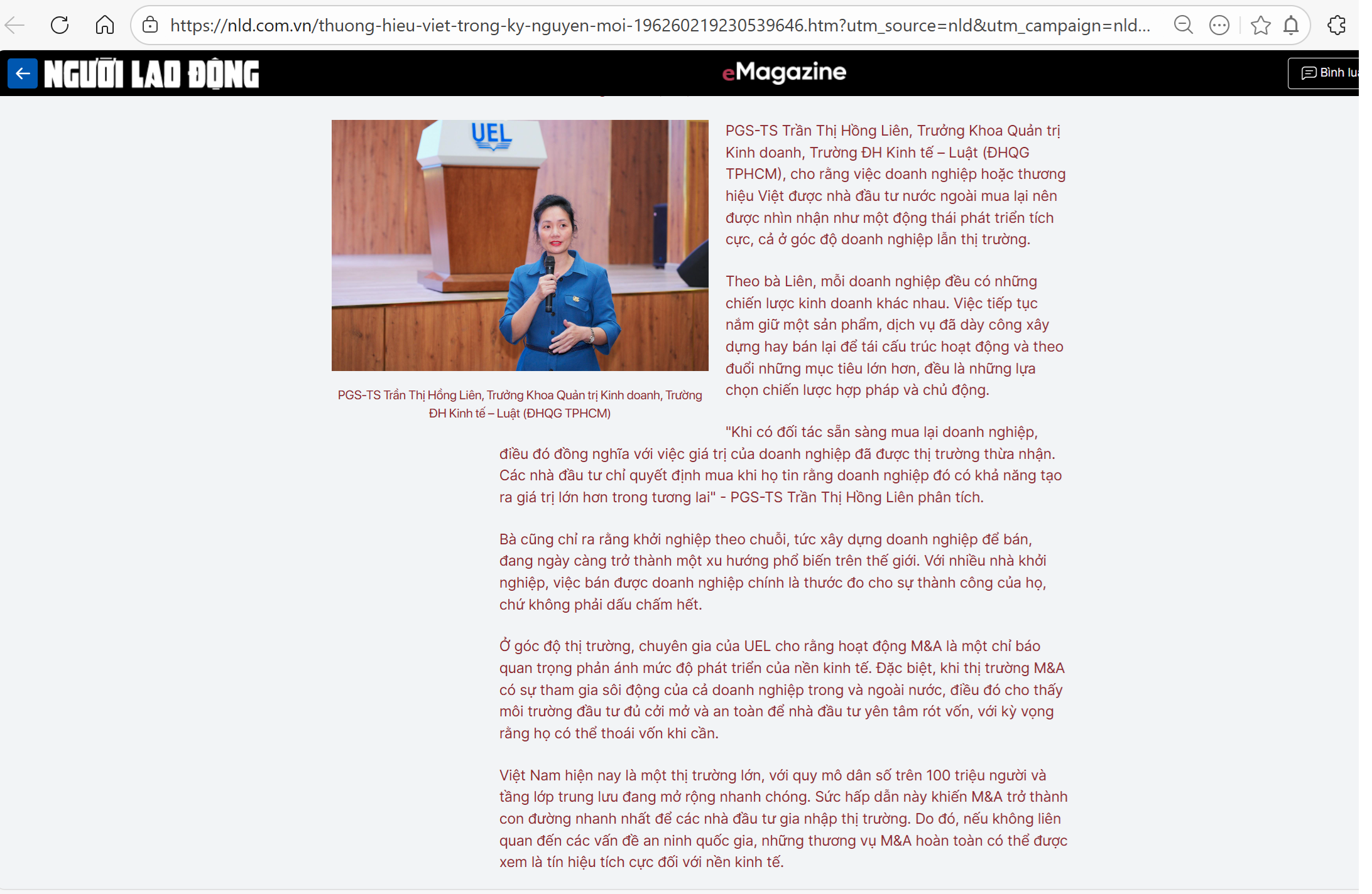 PGS-TS Trần Thị Hồng Liên, Trưởng Khoa Quản trị Kinh doanh, Trường ĐH Kinh tế – Luật (ĐHQG TPHCM), cho rằng việc doanh nghiệp hoặc thương hiệu Việt được nhà đầu tư nước ngoài mua lại nên được nhìn nhận như một động thái phát triển tích cực, cả ở góc độ doanh nghiệp lẫn thị trường.
